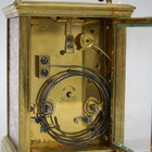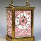 A late 19th Century brass and porcelain carriage clock by Richard & Co, with eight day movement striking hours and half hours on a gong, the porcelain dial with Arabic numerals against a silvered ground filled with dense pink flowers, the porcelain side panels similarly decorated, the case with engraved floral decoration, on bracket feet, height approx 17cm (minor faults).
