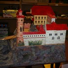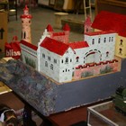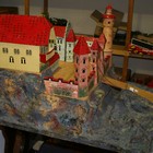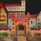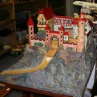 An early/mid-20th Century toy fort with towers, pitched roofs, castellations and a drawbridge, with naturalistic rocky outcrops, height approx 75cm, width approx 72cm, depth approx 94cm (some playwear, restoration and parts missing).