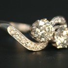 A diamond ring, claw set with the two principal circular cut diamonds between diamond set serpentine shoulders in a crossover design, detailed '18ct'.