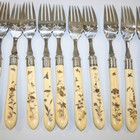 A set of twelve plated fish knives and forks with Japanese shibayama inlaid ivory handles, Meiji period, each plated blade engraved in the Aesthetic taste with flowers and insects, the ivory handles decorated to both sides in mother-of-pearl, hardstones, coral and gilt lacquer with birds, insects and flowers, (splits to some handles and minor inlay losses), within a walnut case.