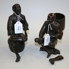 A pair of Japanese brown patinated cast bronze figures of men, Meiji period, the first modelled seated on a drum holding a pipe and tobacco pouch, the other seated on a rock, holding a gourd bottle and cup, carrying a basket on his back, heights approx 20.5cm x 18.5cm (faults).