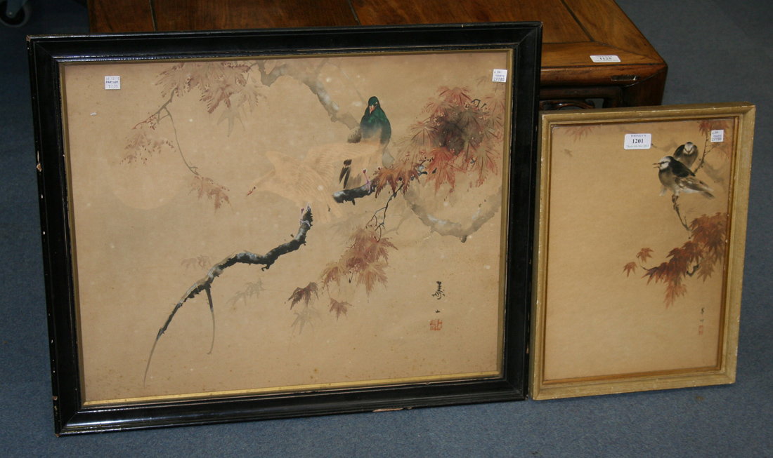 Two Japanese watercolour paintings, Meiji period, each depicting birds in branches, framed and glazed, four Japanese woodblock prints, a Japanese silk embroidered panel and two Japanese paintings on fabric.