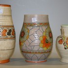Two Crown Ducal Charlotte Rhead designed vases, the first of swollen cylindrical shape decorated with a band of 'commas', pattern No. '4100', the second in the Rhodian pattern, No. 3272, (some faults and restoration), together with a Clarice Cliff floral moulded vase.