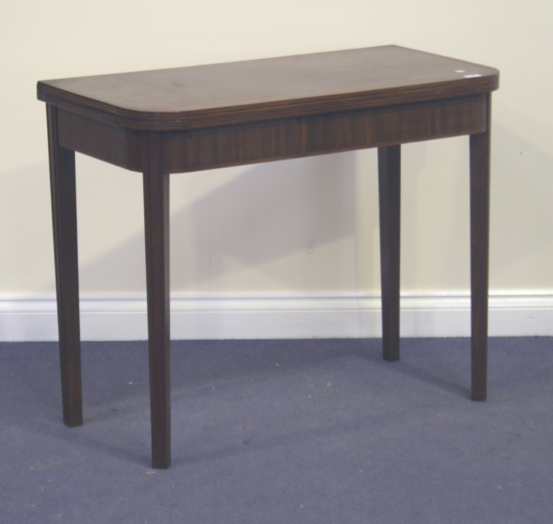 A George III mahogany fold-over tea table, the hinged top above an inlaid frieze, on moulded tapering legs, width approx 91cm.