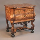 A late 18th Century Dutch marquetry walnut two drawer commode, profusely decorated in various woods with flower-charged urns, birds and foliate scrolling leaves, the serpentine top above a bombé front fitted with two drawers flanked by projecting corners, the downswept scrolling legs united by a shaped platform stretcher, on turned bun feet, height approx 83cm, width approx 82cm (alterations and restoration).