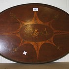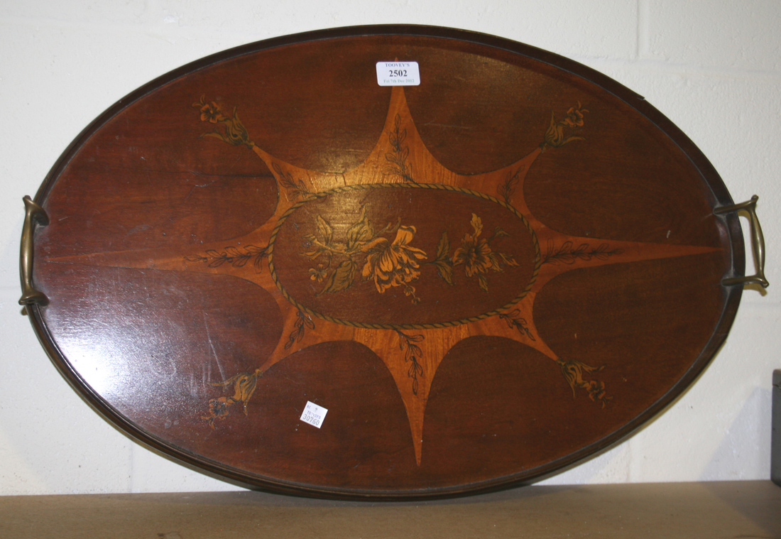 A late Victorian mahogany oval tea tray with inlaid foliate decoration and brass handles, width approx 63cm.