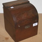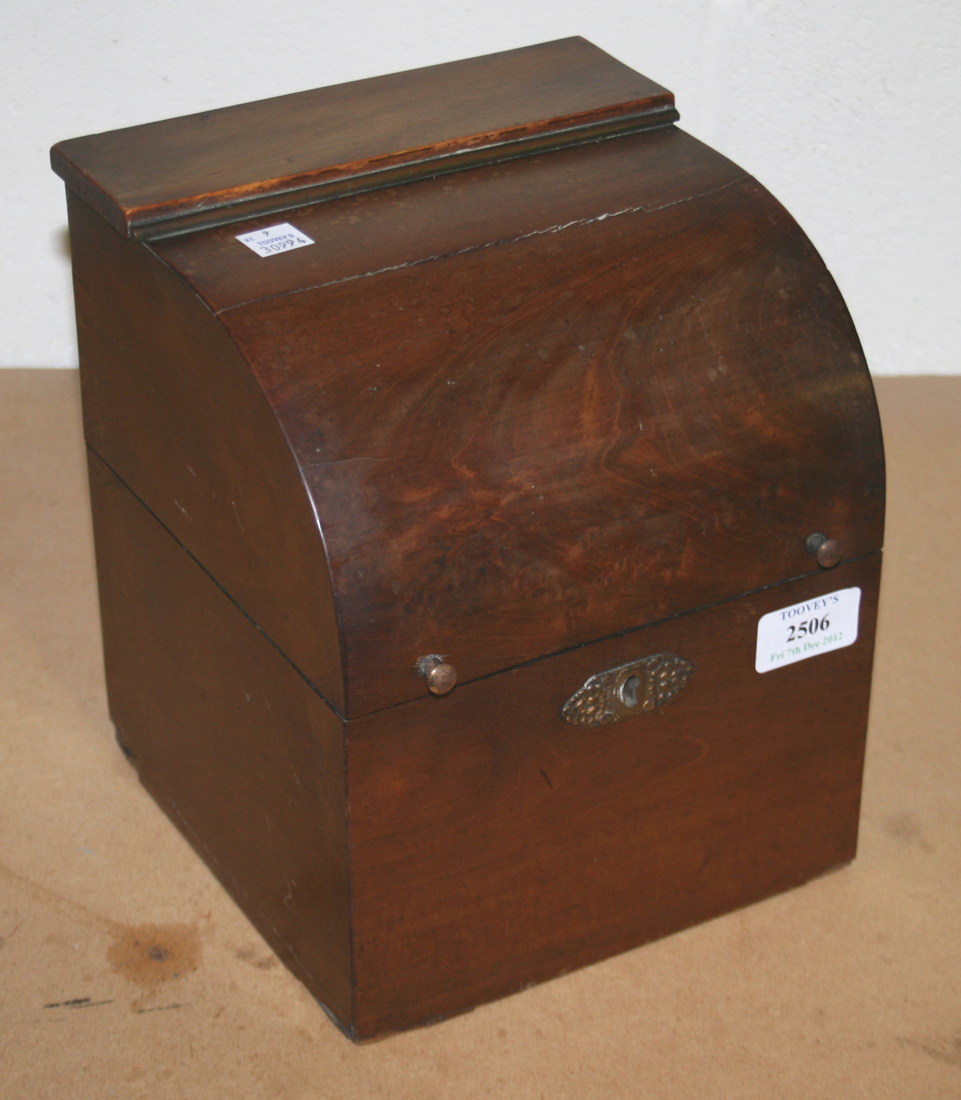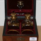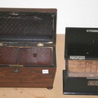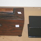 A George III mahogany decanter box, the hinged lid revealing a pair of glass decanters and two glasses (faults), together with a rosewood tea caddy and an ebonized box with applied silver key escutcheon.