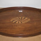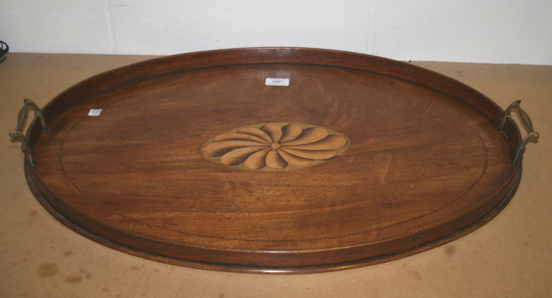 A Victorian mahogany oval tea tray, inlaid with a fan patera within a raised border, with applied brass handles, width approx 71cm.