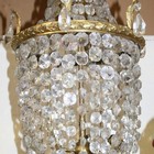 An early 20th Century gilt cast metal and cut glass bag ceiling light, hung with downswept glass swags above a laurel leaf circlet supporting a large bag of glass drops, height approx 70cm.