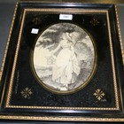 A Regency monochrome needlework oval panel of a lady standing in a landscape, holding a basket, approx 22cm x 16cm, within a verre églomisé mount and an ebonized and gilded frame.