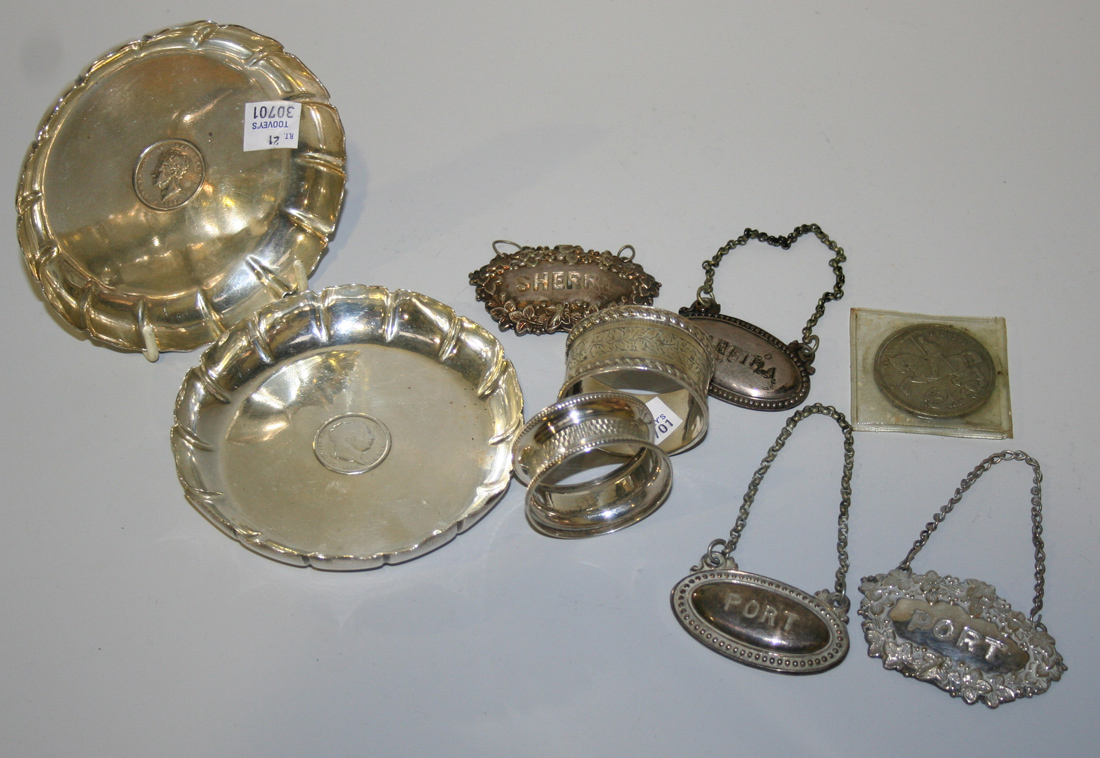 A pair of George V silver bowls, each with petal rim and inset with a coin, London 1926 and 1927 by Sebastian Harry Garrard, retailed by Garrard & Co Ltd, two silver napkin rings, four decanter labels and a coin.