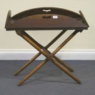 A 19th Century mahogany butler's tray, raised on a satin walnut folding stand (faults).