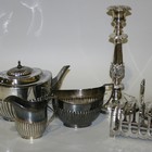 A pair of 19th Century plated candlesticks with acanthus leaf and foliate scroll detail, together with a group of assorted plated items, including a three piece tea set and a toast rack (minor faults).
