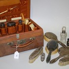 A late Victorian leather vanity case, fitted with various glass silver topped bottles, Birmingham 1897, together with a group of other silver dressing table items.