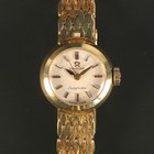 An Omega Ladymatic 18ct gold lady's bracelet wristwatch, the signed silvered dial with gilt baton numerals, gilt hands and centre seconds, the bracelet with a fold-over clasp, Birmingham 1960, cased.