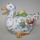A tin glazed earthenware tureen and cover in the form of a duck, probably early 20th Century, naturalistically modelled and painted to one side with fruit and foliage, the cover with lemon finial, together with a ladle with foliate decorated handle, unmarked (some faults).
