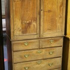 An 18th Century oak tallboy, fitted with a pair of panelled doors enclosing two drawers and a slide above two short and three long drawers, on bracket feet, height approx 190cm, width approx 96cm (alterations).