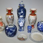 A Japanese Satsuma earthenware vase, Meiji period, painted with birds and flowers, a pair of Kutani vases, a small Japanese dish, five Chinese blue and white porcelain vases and a dish (faults).