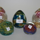 A Mdina glass paperweight of egg shape with internal colouring, together with four other paperweights.