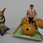 An unusual Carlton Ware football cruet set and stand, modelled as a football player wearing red and white strip standing on a football pitch stand fitted with a salt, pepper and mustard pot and cover in the form of footballs, black printed factory mark to base of stand (small chip to pierced hole of salt), together with a Royal Doulton Bunnykins figure.