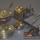 A Victorian brass and cast iron Queen Fire Lighting Fan, patent No. 14935, and a small group of other brass and copperware, including a Dutch brass incense box.
