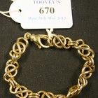 A 9ct gold bracelet in an interwoven and twin oval link design on a sprung hook shaped clasp.