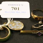 A 9ct gold plain wedding ring, Birmingham 1933, a gem set ring, a gold mounted nephrite band ring, detailed '18k', a gem set bar brooch, a Victorian oval pendant locket, and a small sterling brooch with a paste set thistle motif.