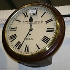 An early 20th Century mahogany circular wall timepiece with fusee movement, the painted dial with Roman numerals and inscribed 'Camerer Cuss & Co, 56, New Oxford St, London', within a moulded surround, the back applied with a 'Camerer Cuss' paper label, diameter approx 36.5cm, together with pendulum and key (replacement bezel).