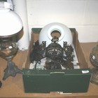 A late 19th Century ironwork hanging oil lamp with a white opaline glass shade, together with another oil lamp and two other lamps.