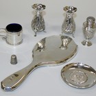 A pair of late Victorian silver baluster specimen vases embossed with spiral foliate scrolls, raised on scroll legs, Birmingham 1896, a Victorian silver pepper caster of baluster form embossed with flowers and leaves, Birmingham 1892, together with a silver salt, a silver hand mirror, a silver dish and a silver thimble.