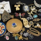 A collection of costume jewellery, including sixteen brooches, various necklaces, a gentleman's pocket watch and chain, two ladies' powder compacts and a Stratton lipstick, fitted with a fan shaped mirror.