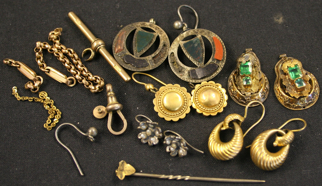 A pair of Victorian gold circular earrings, a pair of hoop shaped earrings, three further pairs of earrings and various jewellery fittings.