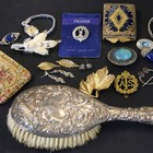 A stained blue gem set brooch of Scandinavian style, six further brooches and pins, a lady's bracelet wristwatch, a bangle, three pairs of earrings, an ATS cap badge, a silver mounted hairbrush with embossed decoration, Chester 1901, a small scent bottle and two further items.