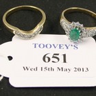 A 9ct gold, emerald and diamond cluster ring, claw set with the oval cut emerald in a surround of circular cut diamonds, and a 9ct gold and diamond set ring in a curved design, mounted with a row of circular cut diamonds.