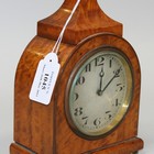 An Edwardian satinwood mantel timepiece, the silvered circular dial with black Arabic numerals, the arched case with pagoda surmount, on gilt brass circular feet (some faults).