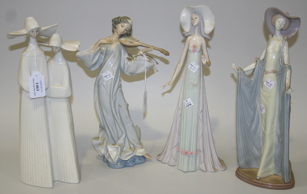 A Lladro porcelain figure group of two nuns, model No. 4611, together with three other Lladro figures, comprising two elegant ladies and a violinist (faults to last three).