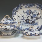 A Spodes New Stone part dinner service, circa 1815, decorated in gilt enriched underglaze blue with perforated rockwork and flowers within a whorl ground rim, pattern No. '3702', comprising a tree and well meat dish, a rectangular meat platter, two soup tureens, covers and stands, three vegetable dishes and covers, three sauce tureens, two covers and three stands, twelve soup plates, twenty-three dinner plates and twelve dessert plates, impressed factory marks to bases (minor faults).