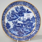 A Worcester porcelain blue printed Bandstand pattern circular saucer dish, circa 1780-90, with gilt line detail and rim, hatched crescent in underglaze blue to base, diameter approx 17.5cm.