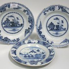 A pair of Dutch delft blue and white plates, mid-18th Century, each painted after the Chinese with a fenced garden and peony within a floral rim, diameter approx 23.5cm, together with another delft plate (faults).