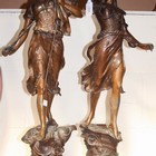 A pair of late 19th/early 20th Century French cast spelter figures of La Guerre and La Paix, one holding a flag, the other a laurel wreath, both raised on turned wooden bases, La Paix with title plaque, heights approx 76cm and 75cm.