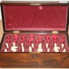 A 19th Century Indian carved and red stained bone chess set of turned form, height of king approx 9cm, within a fitted rosewood box, length approx 34cm.