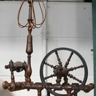 A 19th Century scumbled wood table top spinning wheel of turned construction, fitted with a lead rimmed wheel, on a rectangular plinth, length approx 41cm.