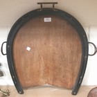 A late Victorian walnut and ebonized tea tray in the form of a horseshoe, with applied brass handles, length approx 53cm.
