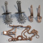 A pair of wrought iron spurs with multi-pointed rowels and tapering heel bands, together with another pair of rowel spurs and a 19th Century engraved steel bit.