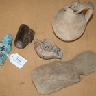 An Egyptian turquoise glazed faience shabti with painted hieroglyphics, length approx 10.5cm, together with a Roman terracotta oil lamp, a pottery ewer, a wooden vessel and a piece of wood from the Chain Pier, Brighton.
