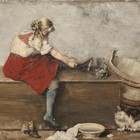 Francis Neydhart - Girl seated on a Trunk fastening her Boot near a Washbowl, Jug and Cat, oil on panel, signed, inscribed and dated 'München '89', approx 26.5cm x 35.5cm.
