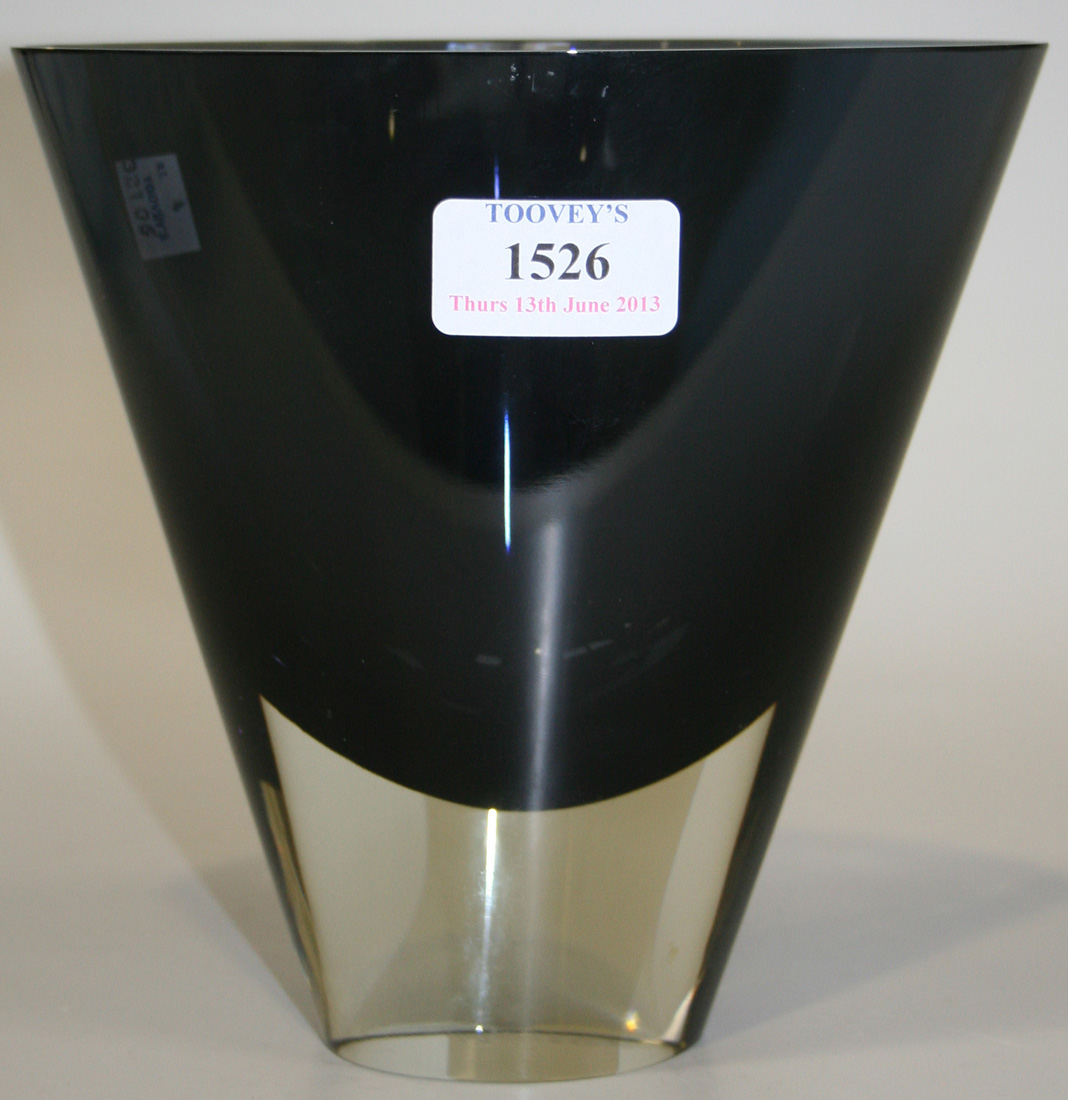 A Nuutajärvi Notsjö cased glass vase, designed by Kaj Franck, of flared oval shape with dark purple to blue colouring above a clear foot, engraved marks to base with numerals '61', height approx 16.5cm.