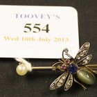A rose diamond, sapphire, quartz cat's eye and gem set bar brooch designed as a winged insect, with a pearl mounted to the bar terminal.