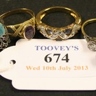 A gold and diamond set single stone ring, mounted with a circular cut diamond between diamond set three stone shoulders, and five further rings.