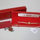 A Vulcain gold cased lady's wristwatch, the pear shaped textured signed gilt dial with black baton and Roman numerals, the case back detailed '14K', on a gilt metal bracelet with the original case, plastic fob, world guarantee and box.